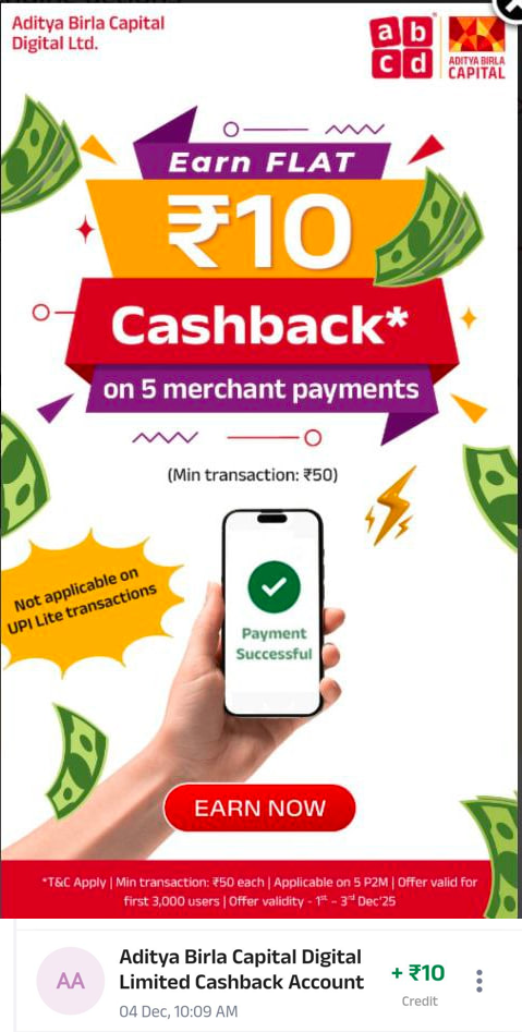 Aditya Birla Capital Digital is offering an exciting limited-time reward for UPI users! Just make 5 P2M (Person-to-Merchant) transactions of ₹50 or more and earn ₹10 Cashback.