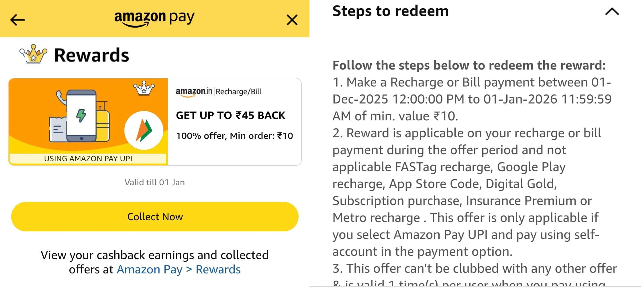 - After successful payment, cashback up to ₹45 will be credited to your Amazon Pay balance.