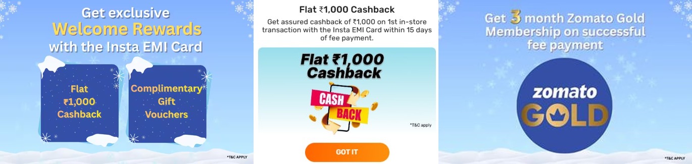 Apply for the Bajaj Insta EMI Card and enjoy ₹1,000 assured cashback, complimentary vouchers from top brands and a free 3-month Zomato Gold membership – all just for activating and using your card.