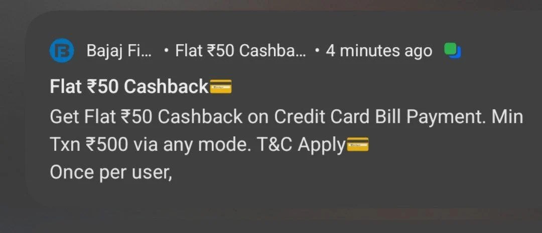 Bajaj Finserv is rewarding users with a flat ₹50 cashback on credit card bill payments of ₹500 or more. This offer is account-specific and valid for a limited time.