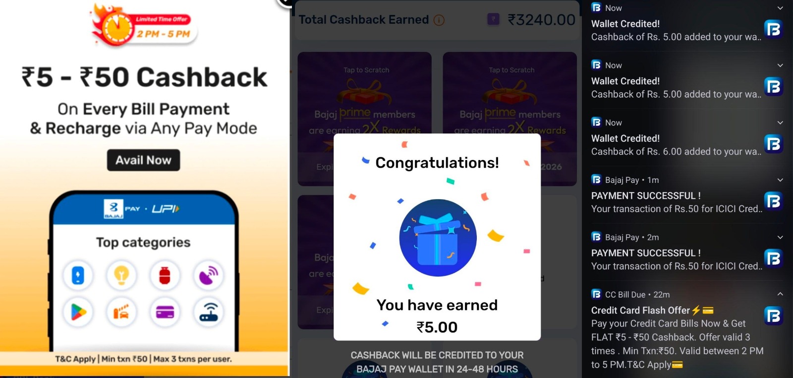 - Cashback is credited as per eligibility (₹5-₹50 per transaction).