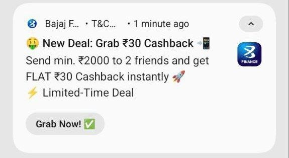 Bajaj Finserv brings you a limited-time offer! Send ₹2000 to two friends via Bajaj Finserv, and you’ll receive a flat ₹30 cashback instantly credited to your Bajaj Wallet.