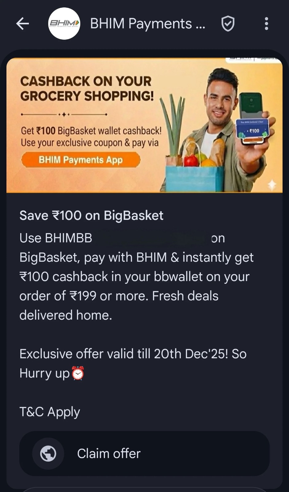 BigBasket is offering an exclusive cashback deal for selected BHIM users. Eligible users who receive the coupon code via SMS can earn ₹100 cashback in their BigBasket wallet by placing an order of ₹199 or more and paying through the BHIM UPI app.