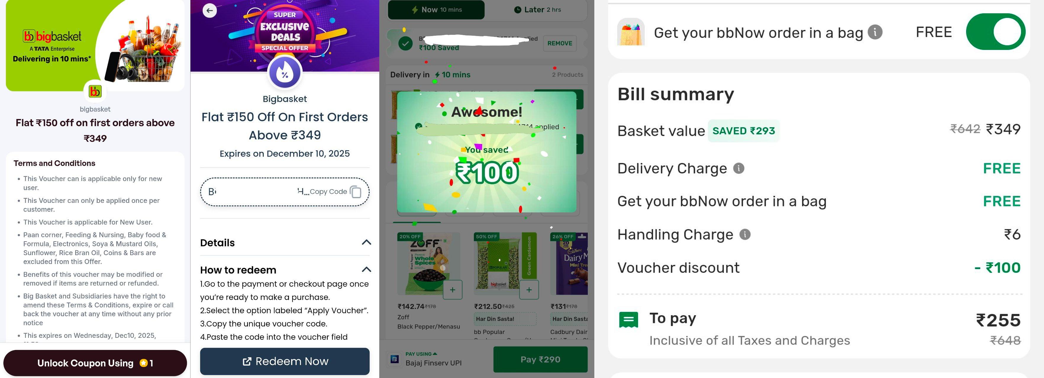 - Redeem the Bigbasket ₹150 Off on ₹349 coupon using just 1 Coin.