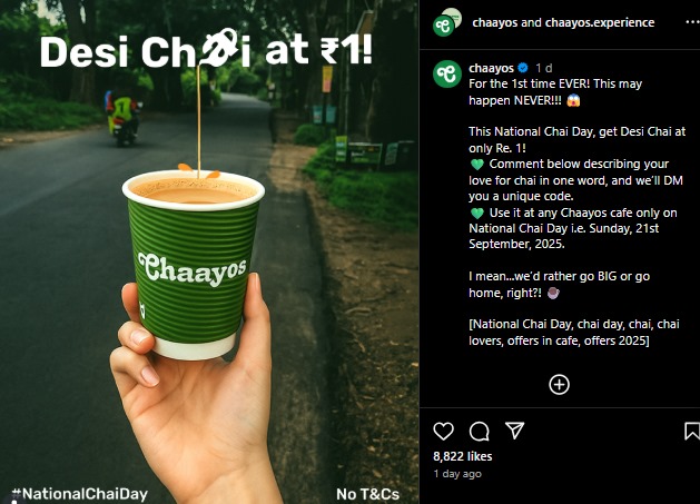 - Visit any Chaayos outlet on National Chai Day and redeem your Desi Chai for just ₹1 by showing the code.