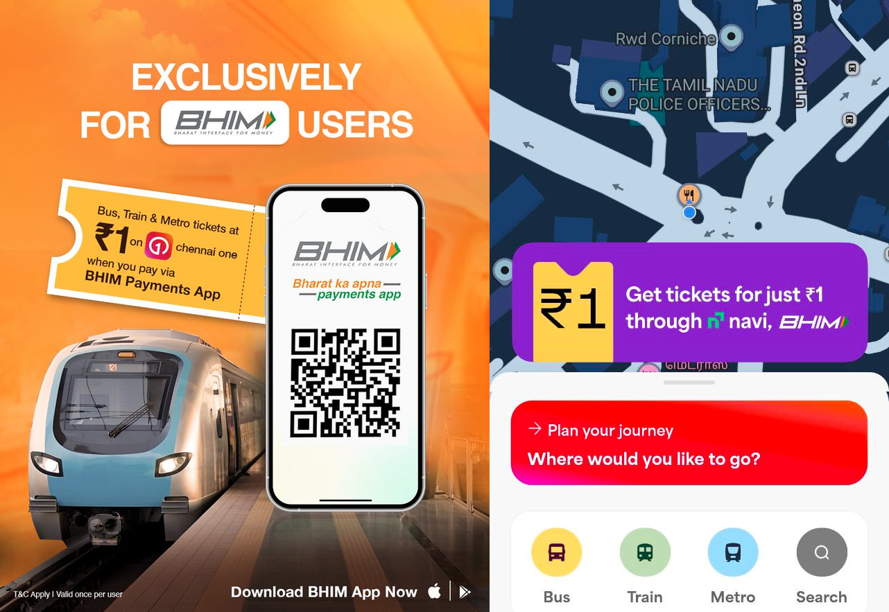 Chennai just made public transport more affordable than ever. Now, book your Bus, Metro, or Suburban Train tickets for ₹1 using the Chennai One app – when you pay via BHIM UPI.