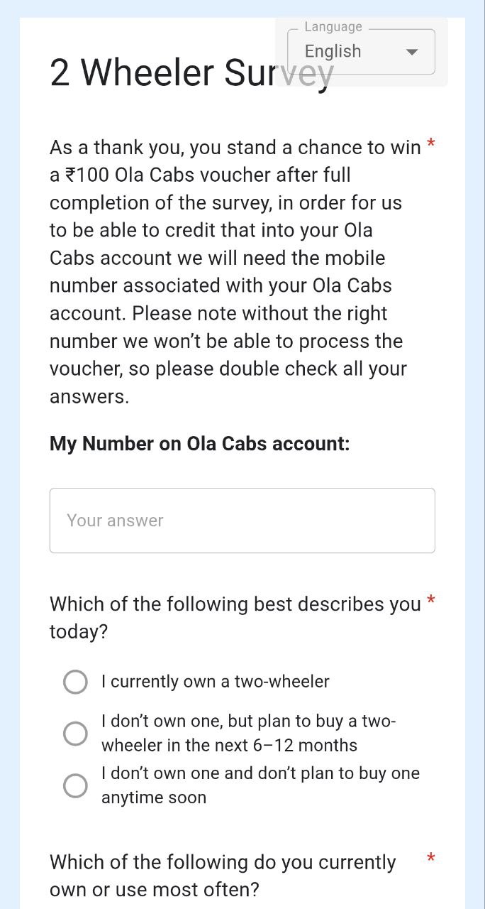 Ola Cabs is offering you a chance to win a ₹100 voucher upon completing a simple 2-wheeler survey.Just answer a few questions and you could get an instant ₹100 Ola Cabs voucher credited directly to your account!