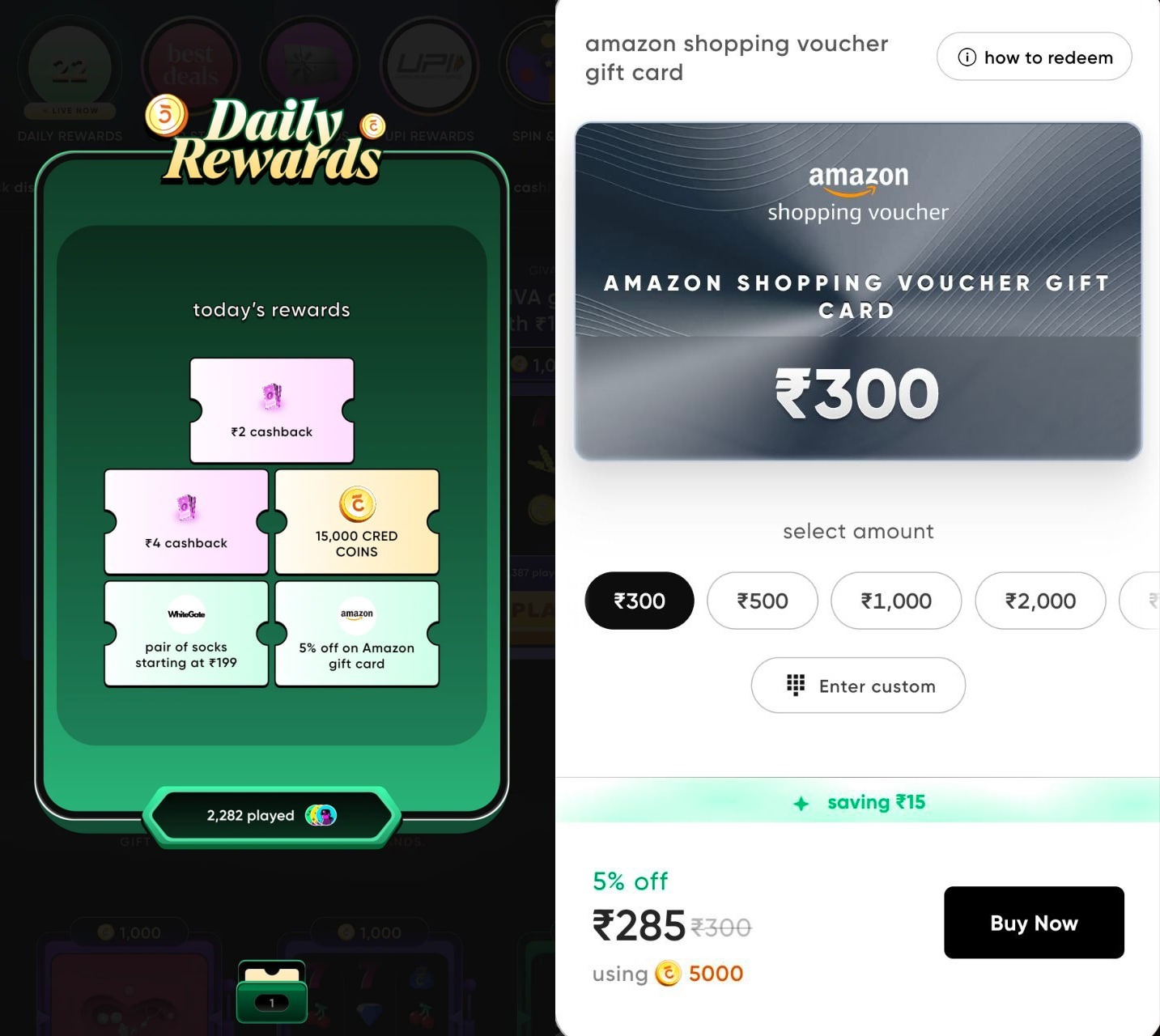 Get rewarded every day with Cred Daily Rewards! Now, enjoy 5% off on your Amazon shopping voucher worth ₹300 when you use your Cred Coins.
