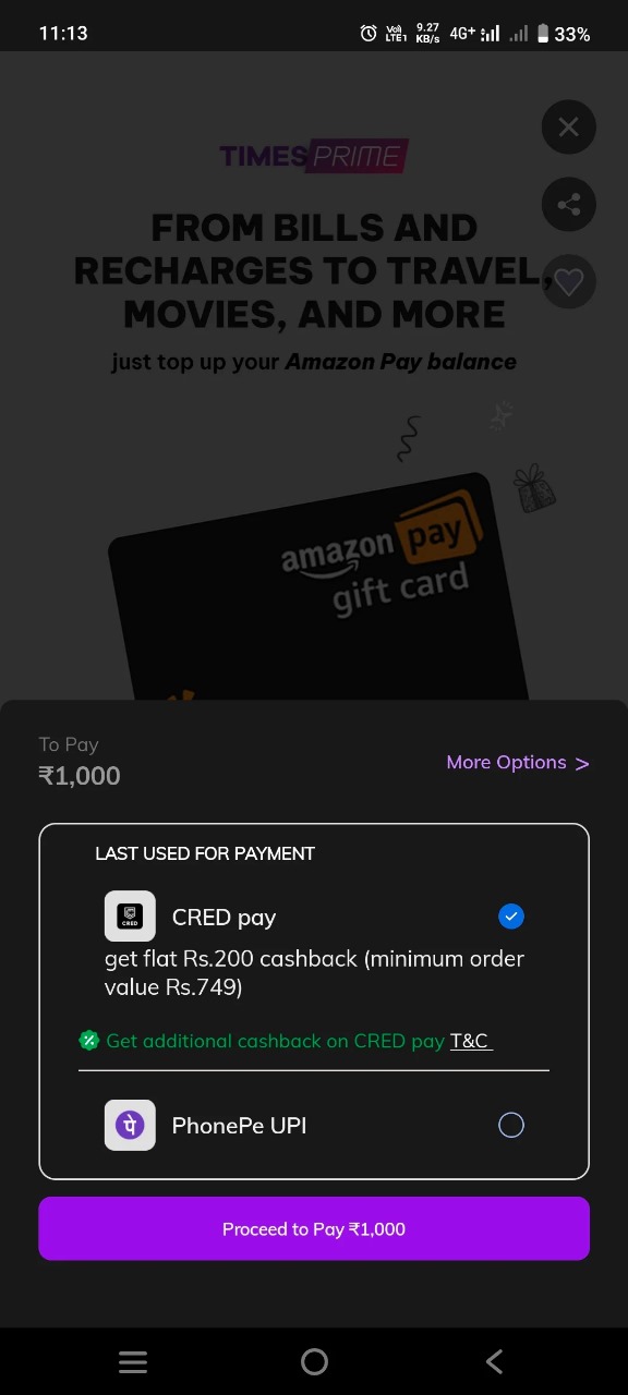 Limited-Time Loot for TimesPrime Members Only!Use your Cred Pay reward to get a ₹200 instant cashback when you buy a ₹1000 Amazon Pay Gift Card on TimesPrime.