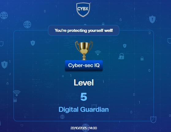 - Earn badges based on your Cyber-Sec IQ Level – from Beginner to Digital Guardian.