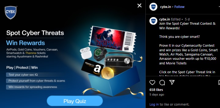 Play a quick 5-question quiz, learn how to stay safe online and win amazing prizes like Gold Coins, Smartwatches, Saregama Carvaan, Amazon Vouchers up to ₹10,000 & Movie Tickets.