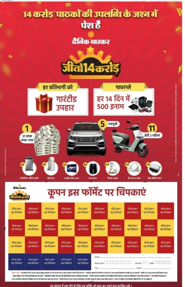 Dainik Bhaskar has launched its annual blockbuster contest “Jeeto 16 Crore” to celebrate its readers. This is one of India’s biggest newspaper-based contests, and participation is open to eligible readers based on local editions.