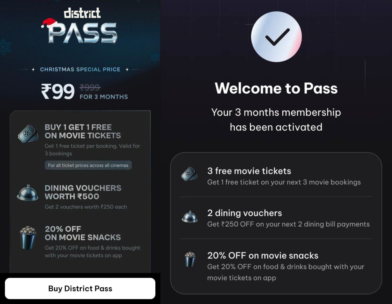 District Pass is offering a Christmas special deal where you get a 3-month membership for just ₹99. This limited-time offer provides benefits for movie lovers and dining enthusiasts.