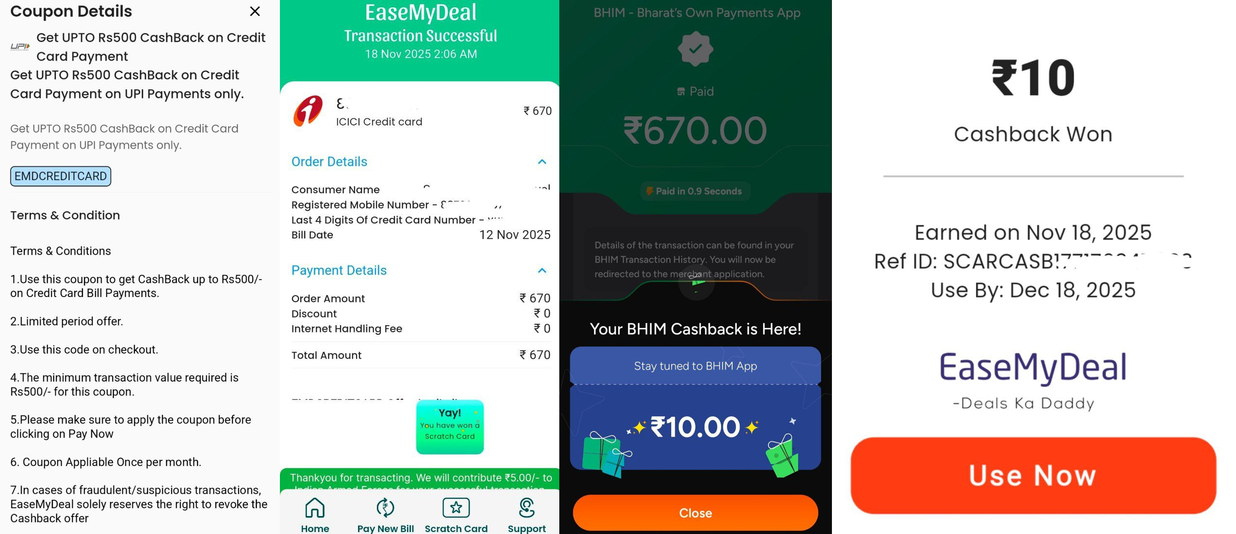 EaseMyDeal is rewarding users with up to ₹500 cashback when pay your credit card bill via UPI using the app. Additionally, if you pay with BHIM UPI, you’ll get a flat ₹10 cashback.
