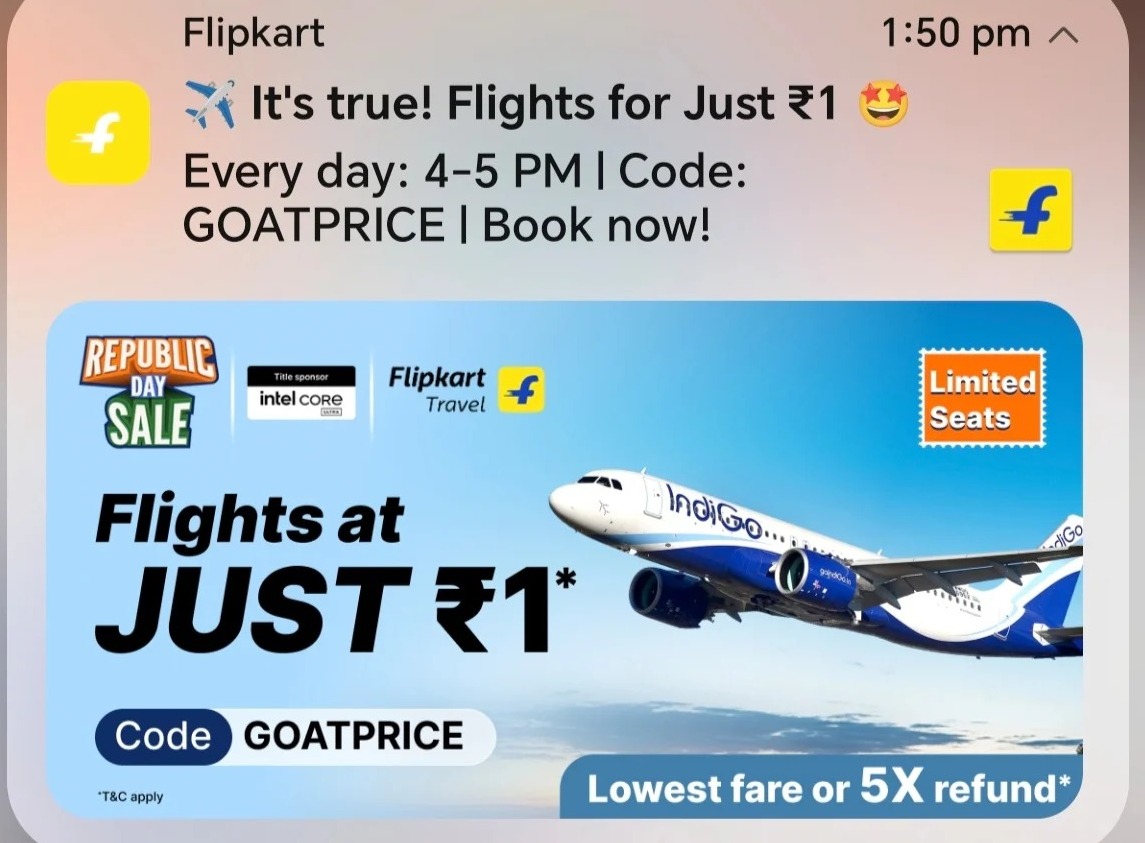 Yes, it’s real – book domestic flights for just ₹1 with Flipkart Travel during the Republic Day Sale. This limited-seat offer is available daily between 4 PM to 5 PM
