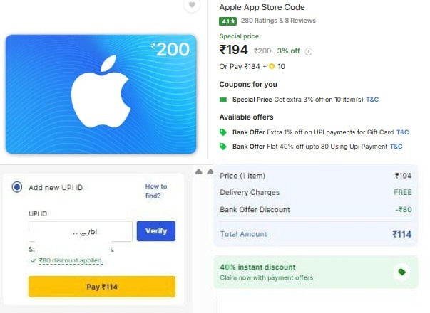 Get a 40% OFF + 3% Discount on Apple App Store ₹200 code, bringing price down to just ₹114 on Flipkart! This offer applicable when using UPI payment and Flipkart SuperCoins.