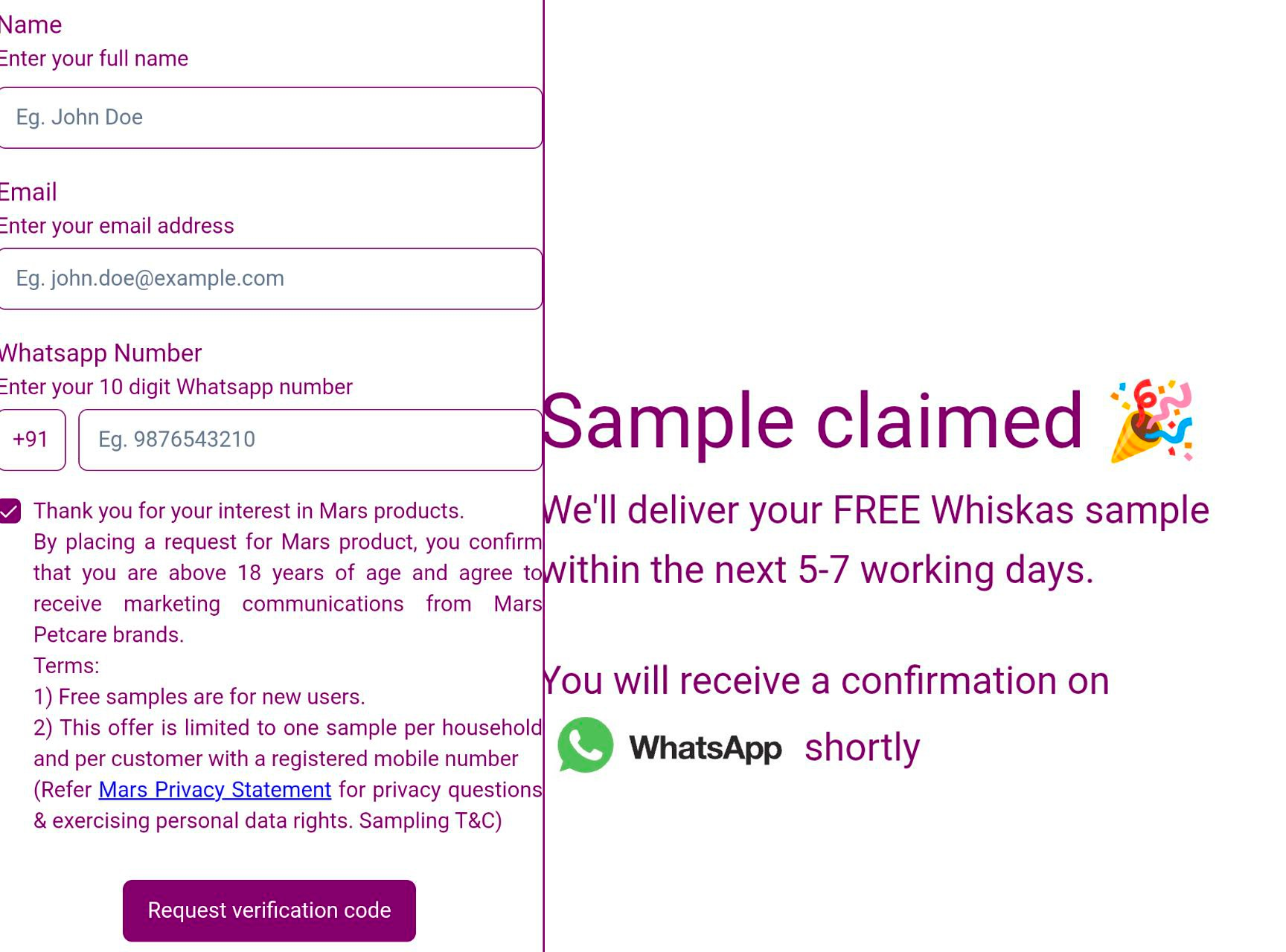 - Confirm your request, and your free Whiskas sample will be delivered to your doorstep!