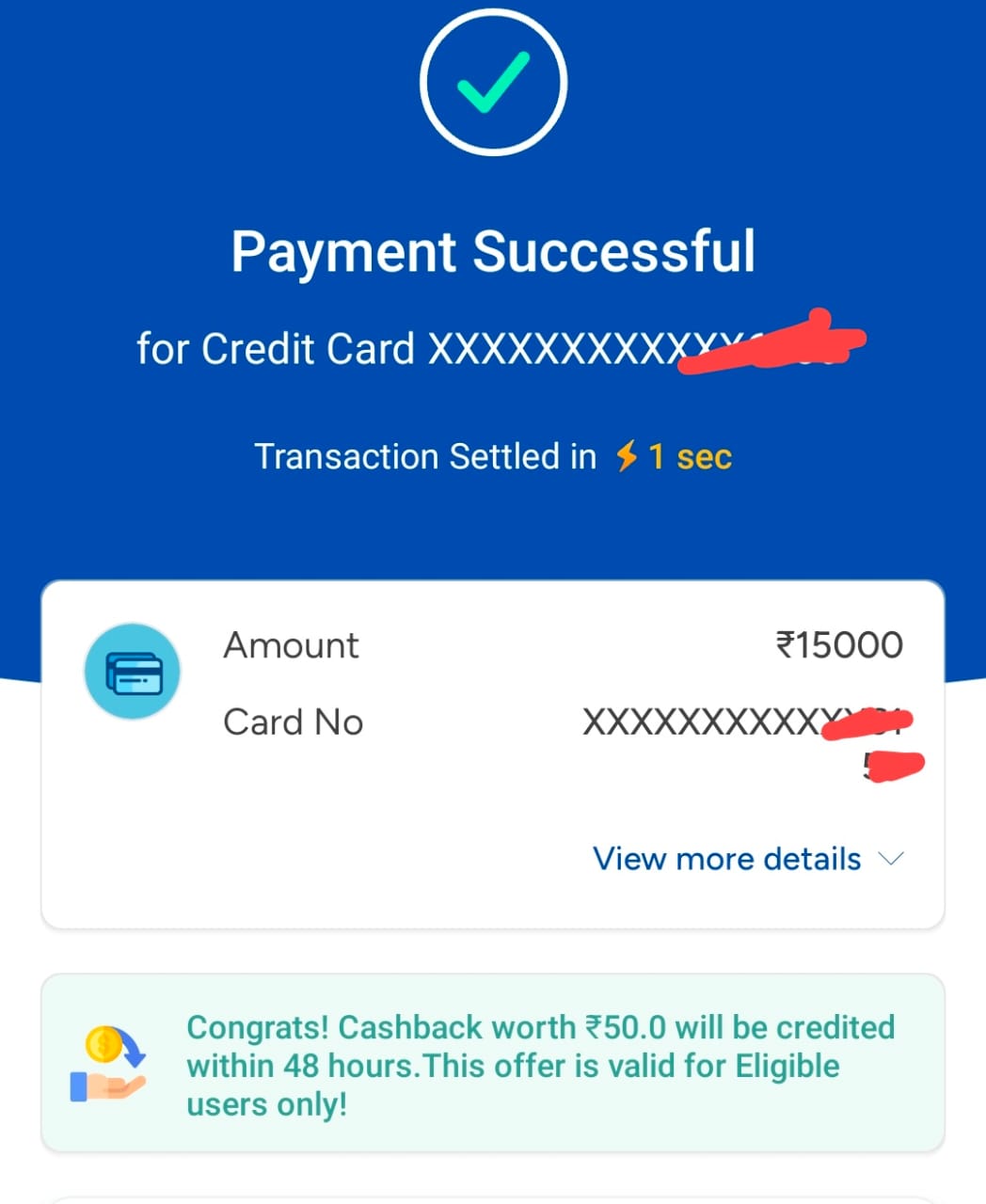 - Get ₹50 cashback instantly for payments of ₹15,000 or more.