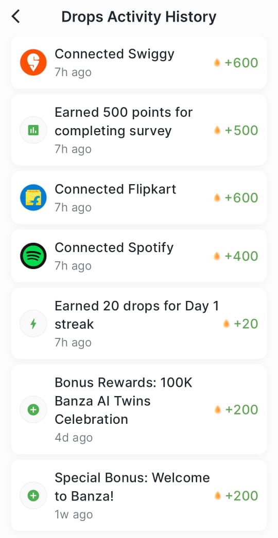- Start earning Drops (reward points) by Connecting apps, Opening the Banza app daily (daily check-in), Completing small surveys, Referring 2 friends (each friend must connect at least one app)