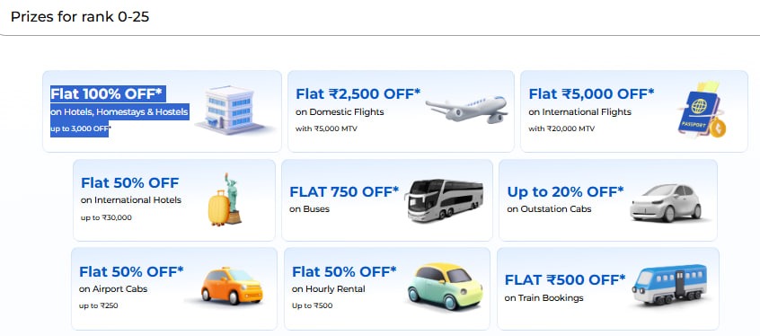 - Top scorers get rewarded with exciting flat discounts such as 100% off on hotels (up to ₹3,000), flight discounts, bus booking discounts, and more.