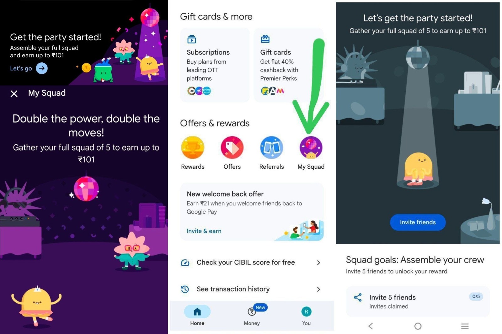 Join the party on Google Pay! Invite your friends, build your squad, and unlock a scratch card worth ₹11 to ₹101. This exciting “My Squad” offer is live for all users.