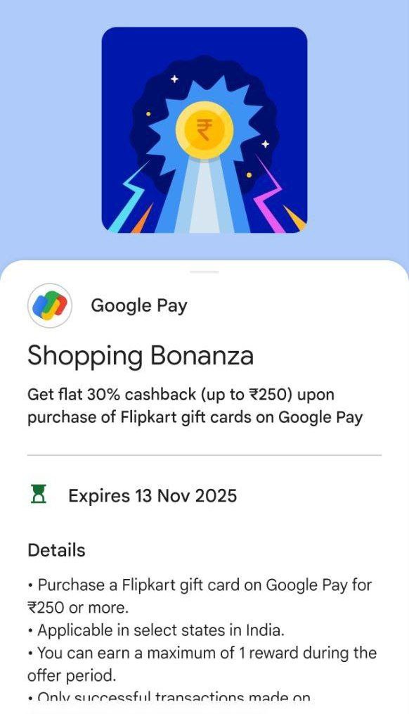 Google Pay is back with another exciting shopping reward! Now get 30% cashback up to ₹250 when you buy Flipkart Gift Cards directly through Google Pay.