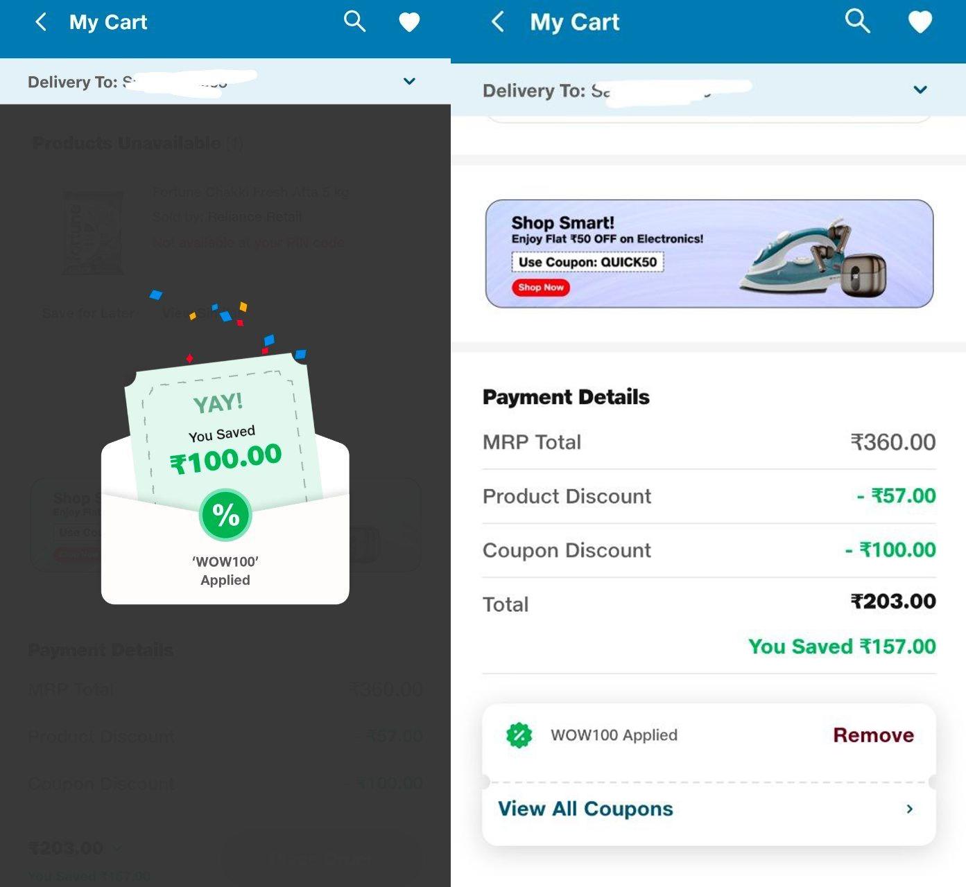 JioMart has launched a flat ₹100 discount offer for all users! Use the coupon code WOW100 on your order worth ₹299 or more and save instantly.