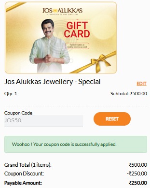 - Flat 50% OFF on Jos Alukkas e-Gift Cards.