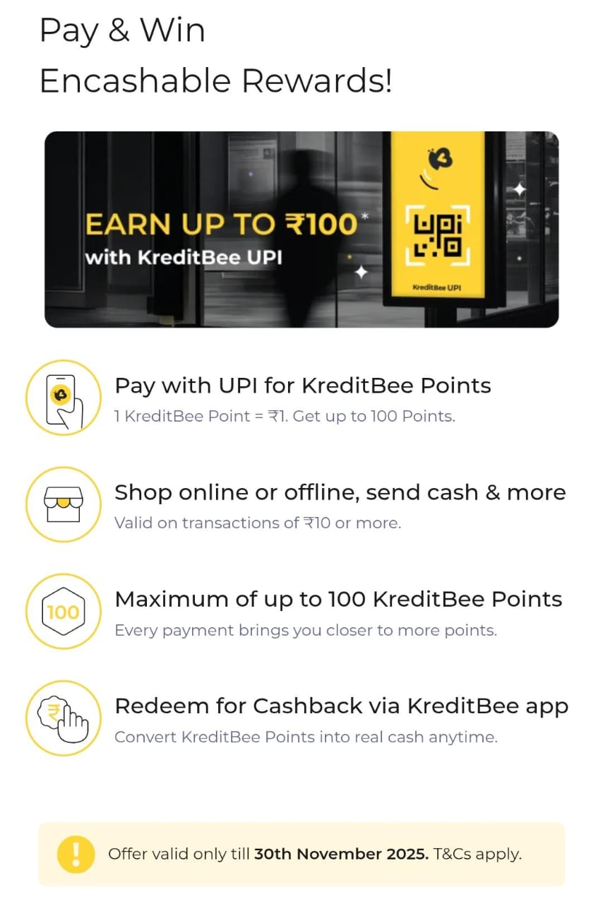 Don’t miss this rewarding opportunity from KreditBee. Make your regular UPI transactions through KreditBee and get up to ₹100 as instant rewards.