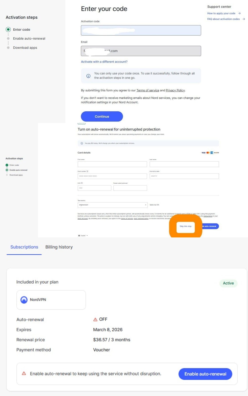 - Enter the activation code (if provided) and your registered NordVPN email ID.
