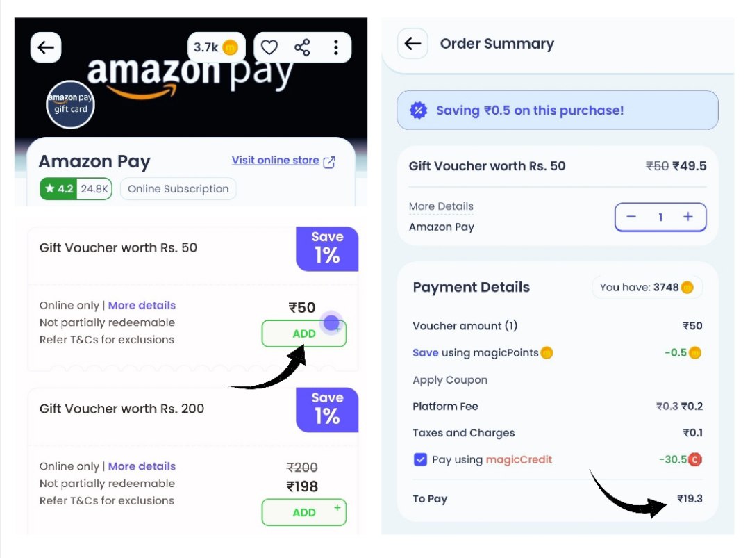 - Use those c magicCredits to pay for products (including Amazon gift cards) on Magicpin.