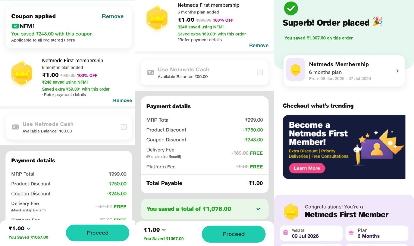This is one of the best healthcare deals available right now. For just ₹1, enjoy six months of premium Netmeds benefits – discounts, free delivery, fast shipping, and rewards.