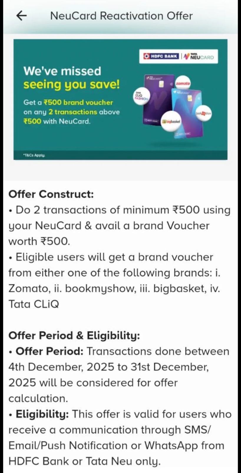 This NeuCard Reactivation Offer is to save ₹500 while spending on your regular needs. Complete 2 eligible transactions before December 31st, 2025 and claim free brand voucher.