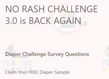 The popular No Rash Challenge 3.0 is back Feather Diapers is giving you a chance to try their premium diaper absolutely free. Just answer a few quick survey questions and get a free diaper sample delivered to your doorstep.