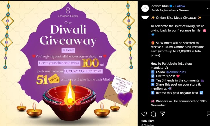 Don’t miss this chance to make your Diwali extra fragrant and special! Participate today, and you could be among the 51 winners of Ombre Bliss’s Luxury Perfume Giveaway.