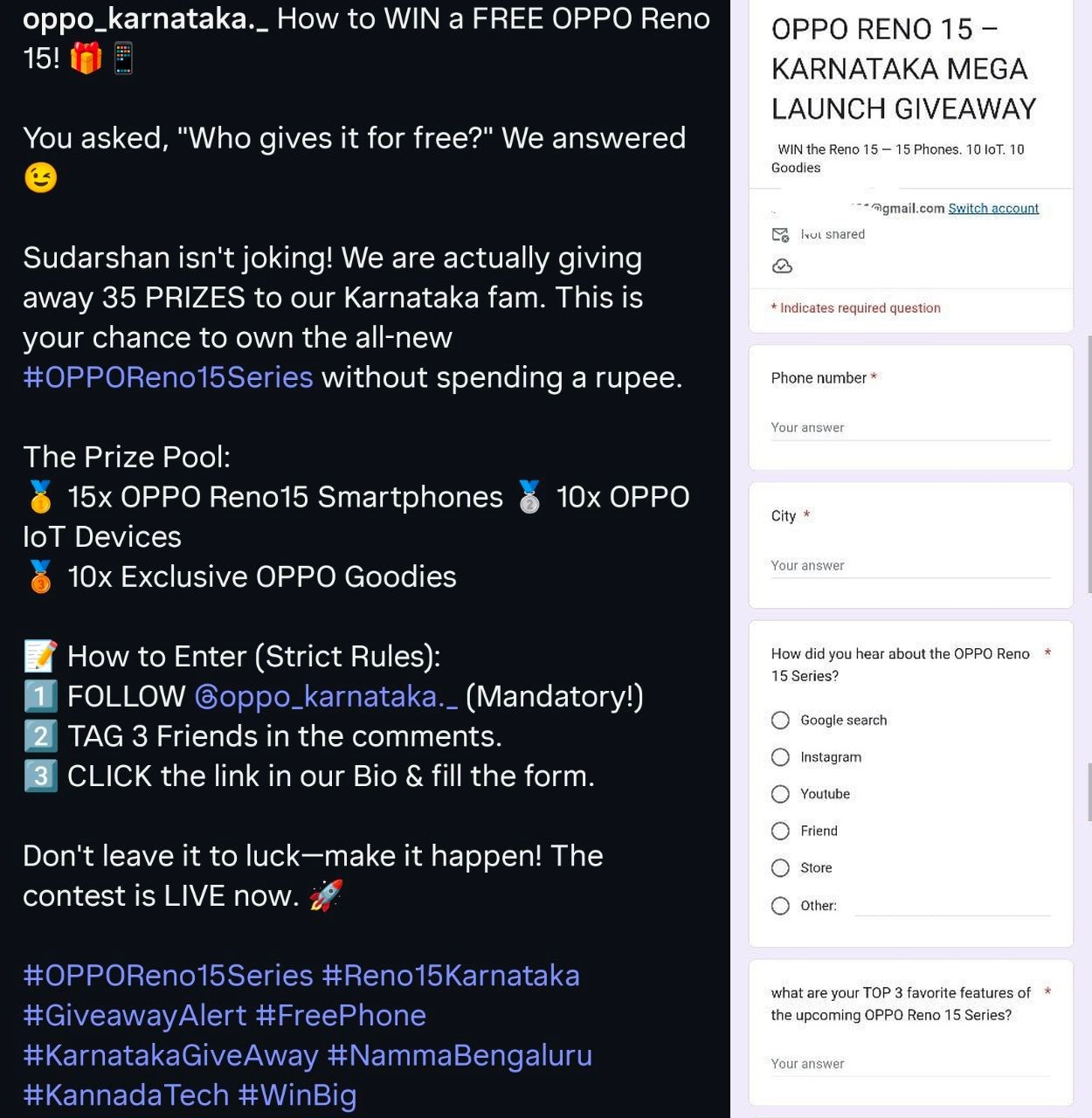 Here’s a massive launch giveaway exclusively for Karnataka! OPPO is celebrating the launch of the Reno 15 Series by giving away 35 exciting prizes, including FREE OPPO Reno 15 smartphones, IoT devices, and exclusive goodies.