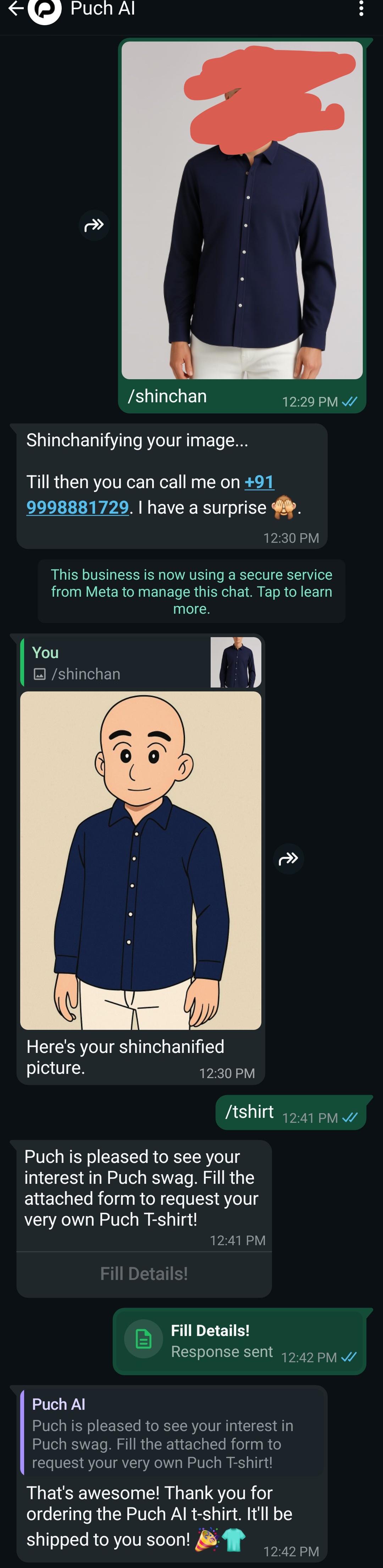6. Go back to WhatsApp, send /tshirt, and fill out your details, including the Twitter post link.