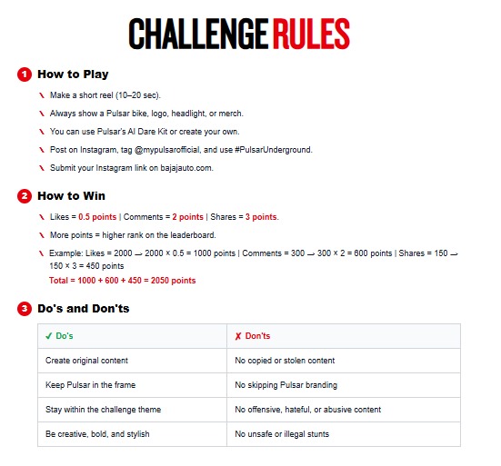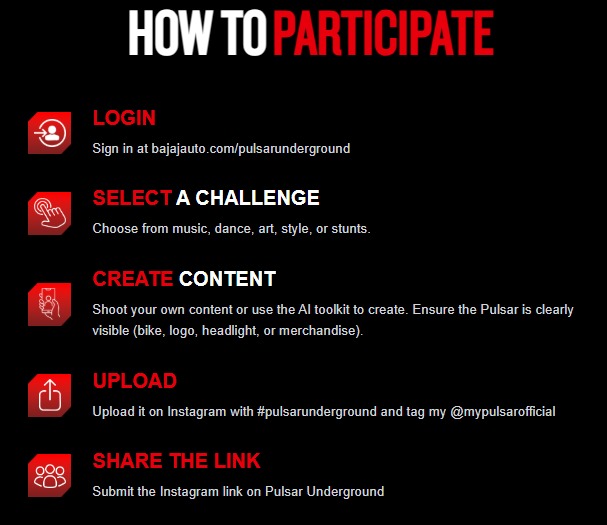 - Post your reel on Instagram with #PulsarUnderground and tag @mypulsarofficial.