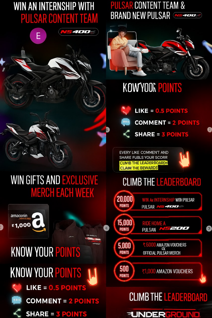 - Rewards Based on Points- 20,000 Points – Internship + Pulsar NS400, 15,000 Points – Pulsar NS200, 5,000 Points – ₹6,000 Amazon Voucher + Merchandise, 500 Points – ₹1,000 Amazon Voucher.