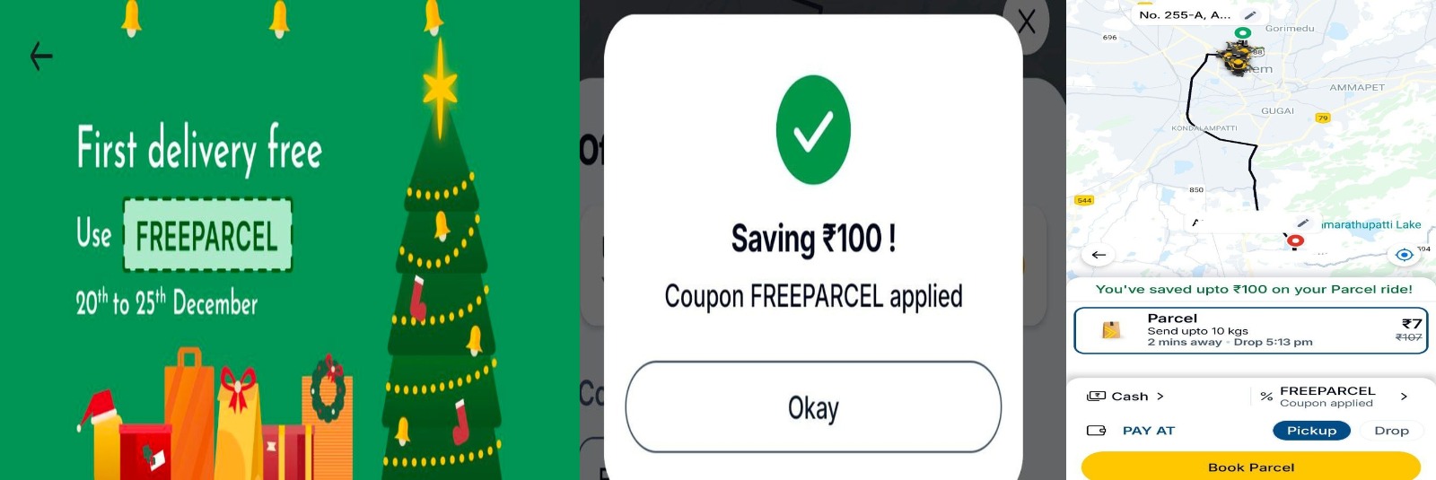 Rapido is offering a limited-time Christmas special to all new users! Enjoy your first delivery completely free when you use the coupon code FREEPARCEL.