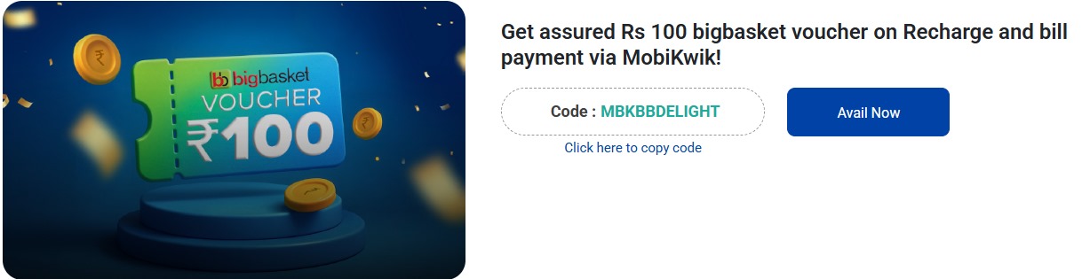 This is a great opportunity to save on your daily essentials! Just recharge or pay bills worth ₹499 or more on MobiKwik using the code and enjoy a guaranteed ₹100 BigBasket voucher.