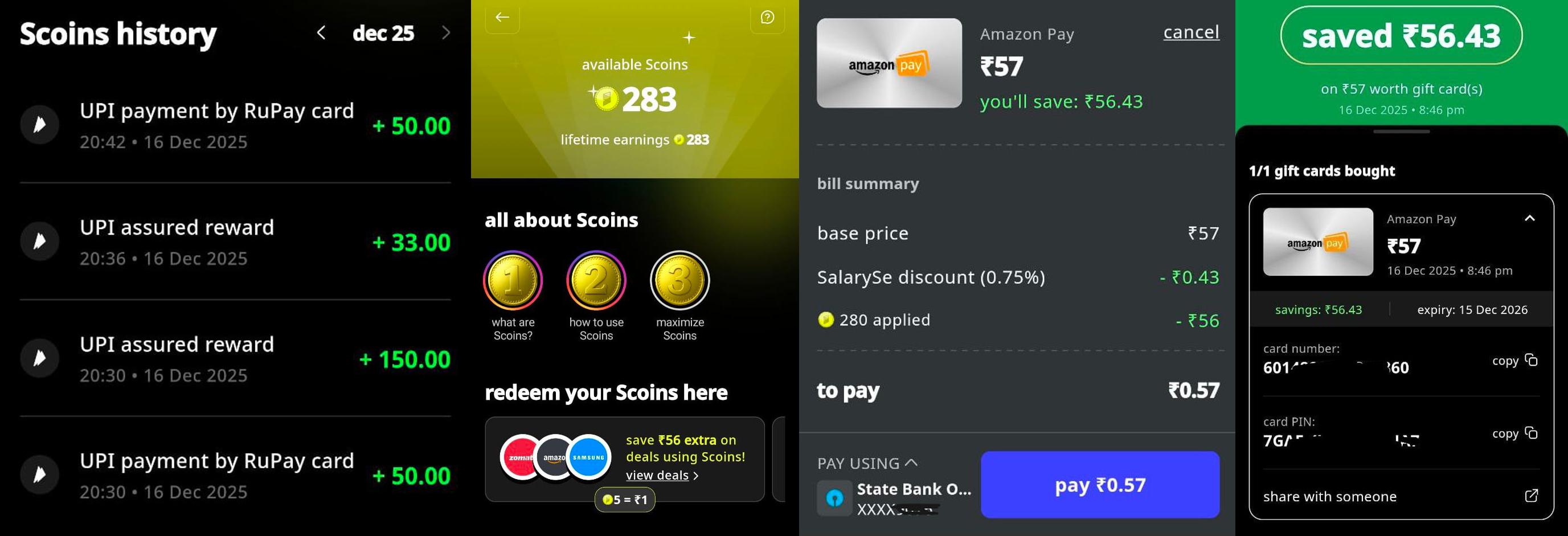 Earn up to 250 Scoins as a welcome bonus, get 5% Scoins back on all UPI merchant payments, and redeem those Scoins for Amazon Pay gift cards starting at just ₹10.