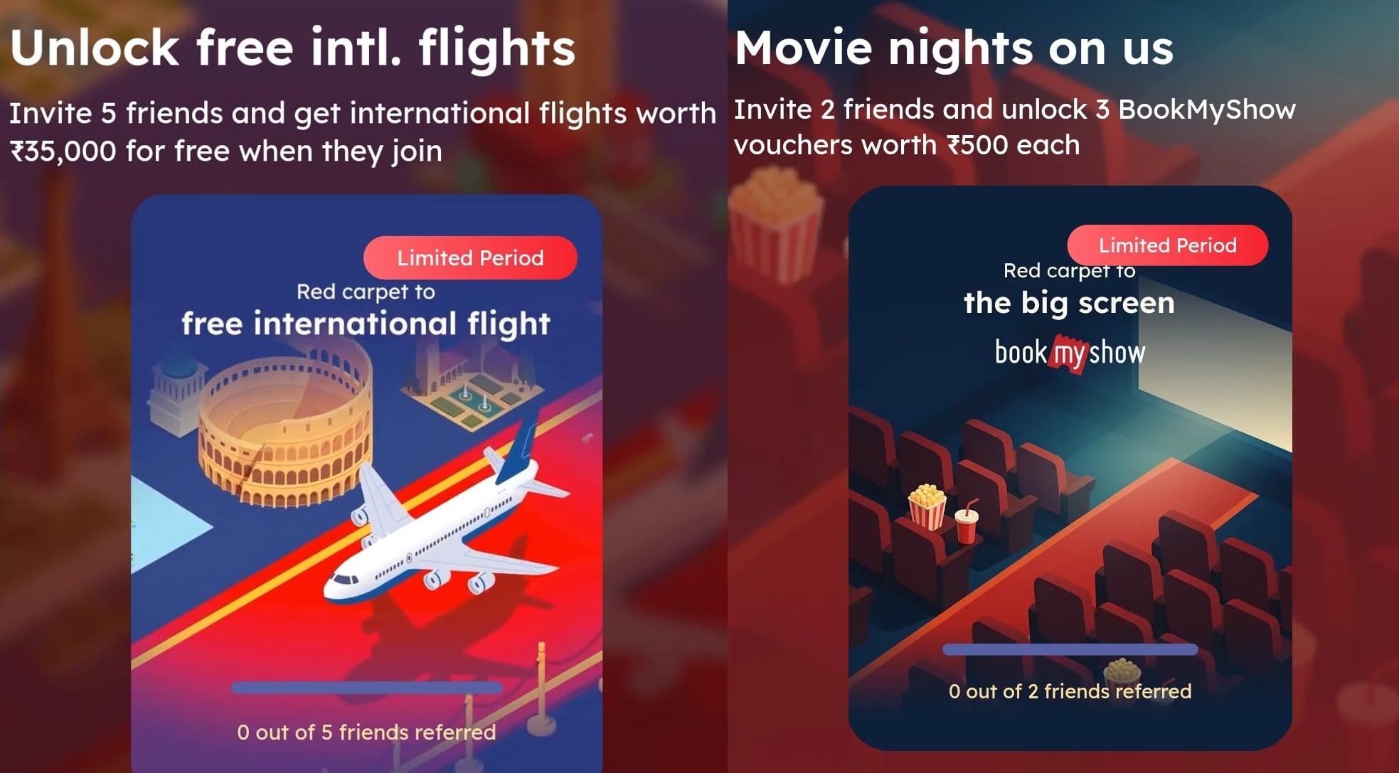 - Get Rs.35000 FREE International Flight By 5 Refer & Rs.1500 Bookmyshow Rs.1500 Giftcard By 2 Referral Only.
