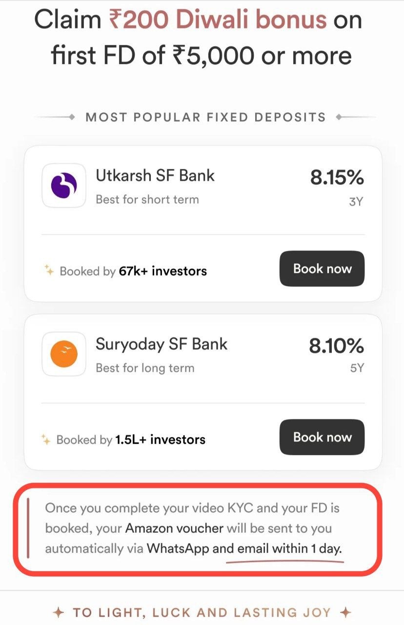 Make your money work smarter this Diwali! Invest ₹5,000 or more in a Stable Money FD, complete your KYC and grab your ₹200 Amazon Gift Voucher within 24 hours.