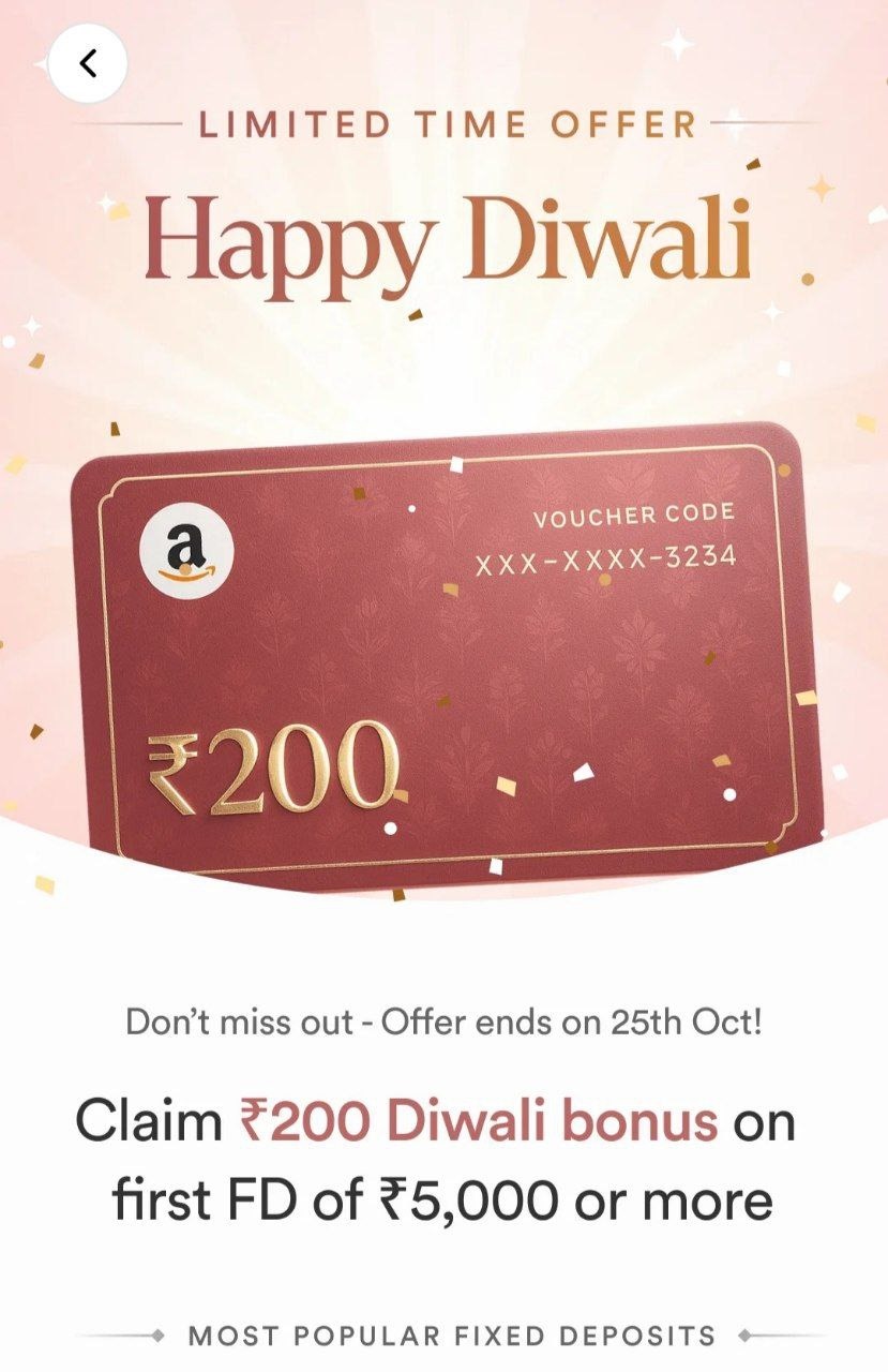 Celebrate this Diwali with smart savings and exciting rewards! Stable Money is offering ₹200 Amazon Gift Voucher when book your first Fixed Deposit (FD) worth ₹5,000 or more.
