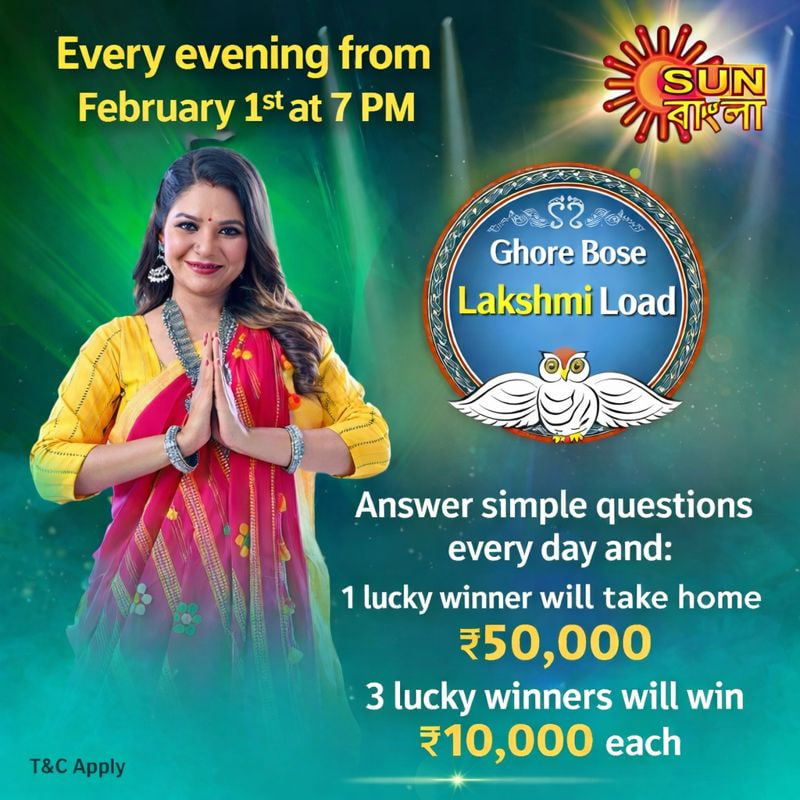 Sun Network brings an exciting daily contest on Ghore Bose Lakshmi Labh, telecast on Sun Bangla TV. Watch the show every evening, and stand a chance to win cash prizes up to ₹50,000.