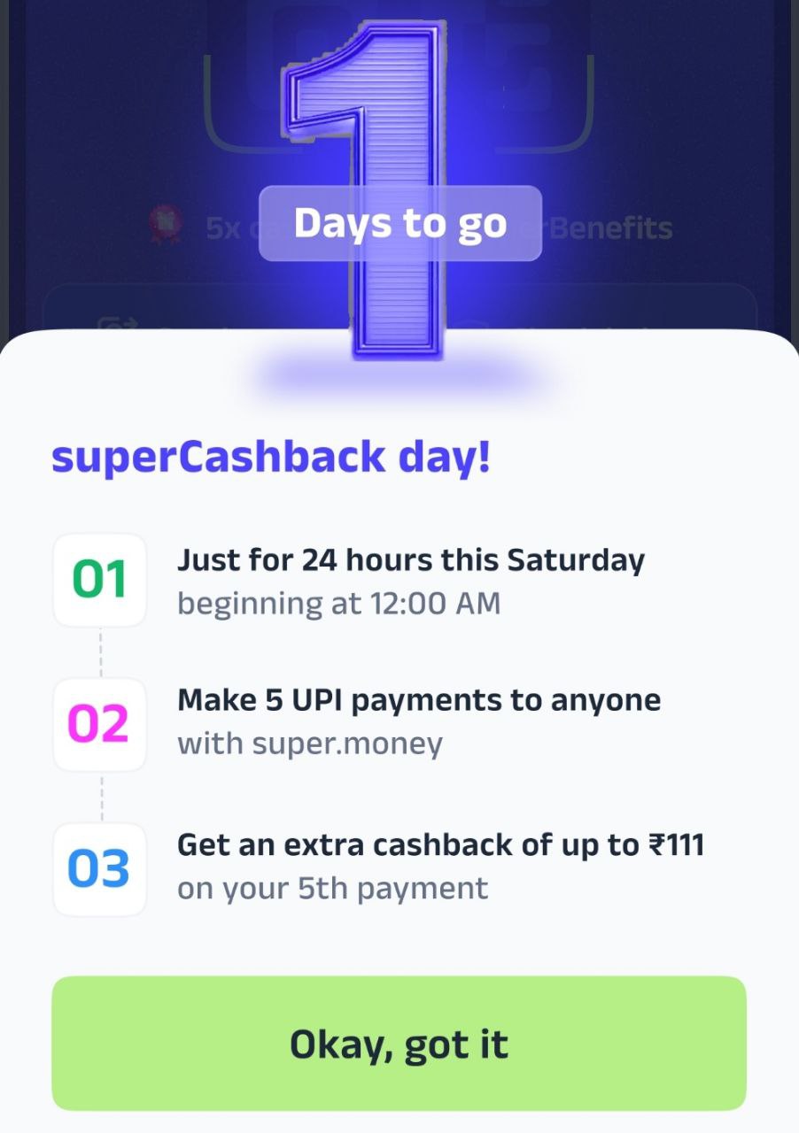 Don’t let your Saturday go to waste – complete 5 simple UPI payments and earn up to ₹111! Whether you’re sending money to friends or paying bills, Super.Money is giving you a smart reason to make that 5th transaction count.
