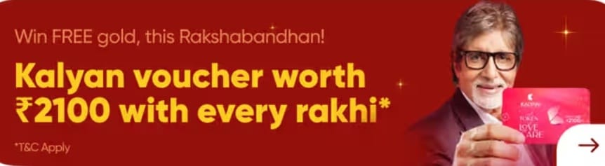 4. Look for the Rakhi Offer Banner featuring Amitabh Bachchan and the ₹2100 Kalyan Voucher.