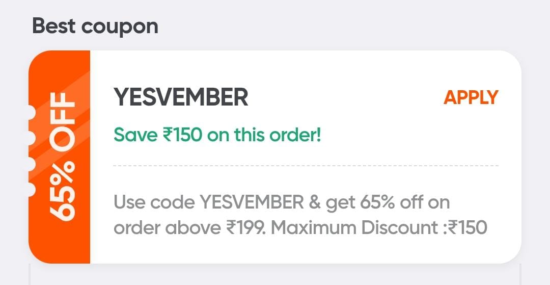 Enjoy a delicious discount on your food orders this November! Swiggy is running a limited-time YESVEMBER offer where you can get 65% off (up to ₹150) on orders above ₹199 from select restaurants.Perfect for lunch cravings, dinner plans
