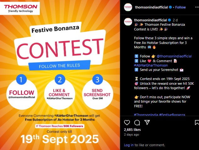 Don’t miss this golden opportunity! Follow, like, comment, and take part in the Thomson Festive Bonanza Contest today. Help Thomson reach 50K followers and get ready to enjoy your free Jio Hotstar subscription.